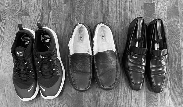 His shoes represent the roles he plays in life showing first he is a father, second his passions, and lastly his career.